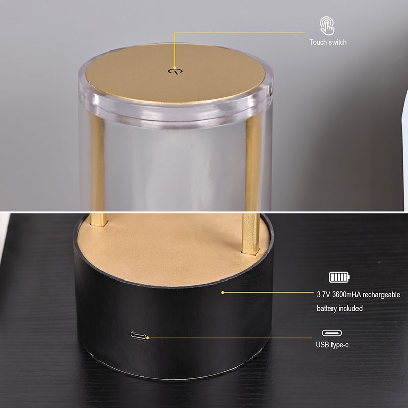Fənər Stilli Kiçik Stol lampasının yuxarı hissəsi toxunuşa həssas işıq açarıdır, aşağıda c tipli təkrar doldurulan doldurma başlığı var. Üstü şəffaf akril örtükdən, alt hissəsi isə metal əsasdan ibarətdir. Ümumi dairəvi quruluş daşınan işıqlandırmaya imkan verir