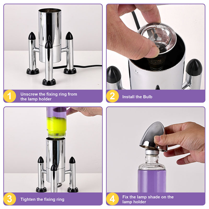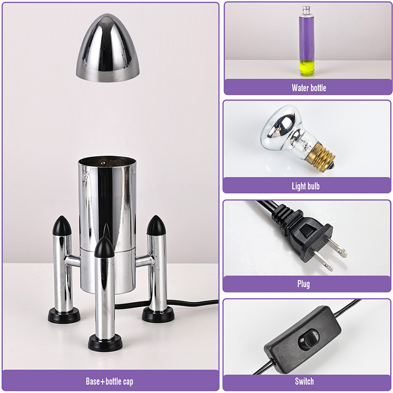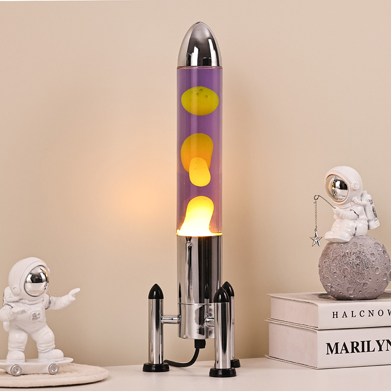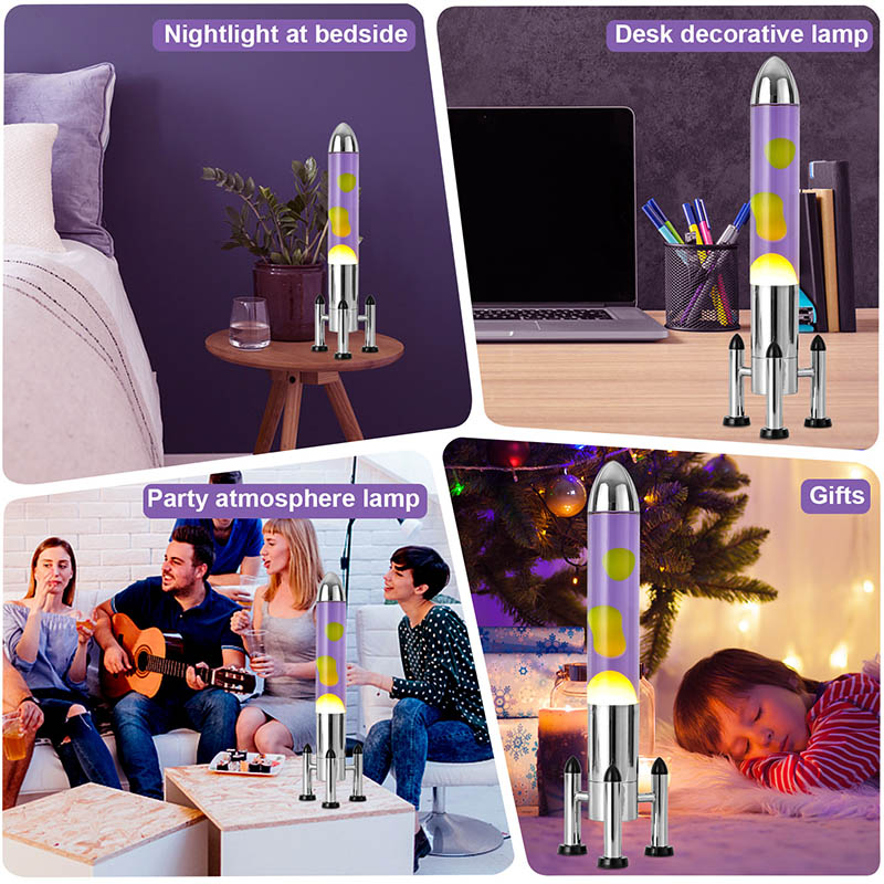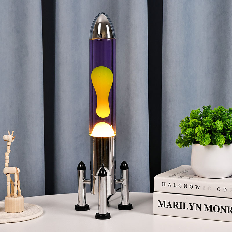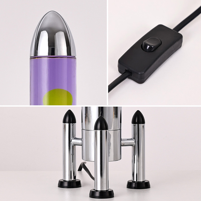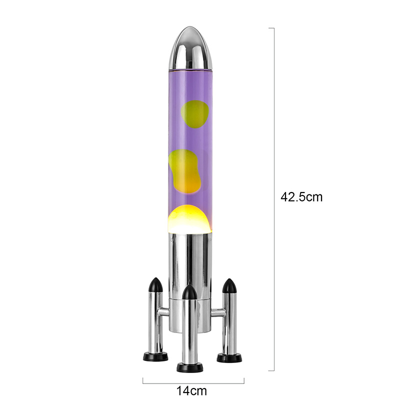 24VRaket kölgəsi olan böyük LED Lava lampası klassik raket formalı dizayna malikdir, gümüşü metal qabığı şəffaf şüşə butulka gövdəsi ilə birləşdirilmiş, sadə, lakin şıkdır. İçindəki bənövşəyi mayenin içində sarı üzür