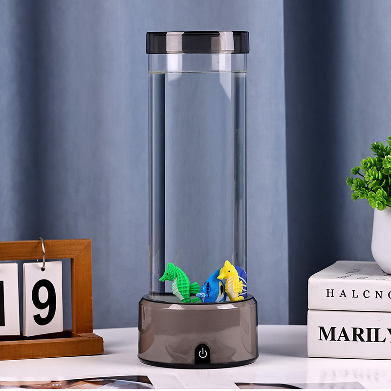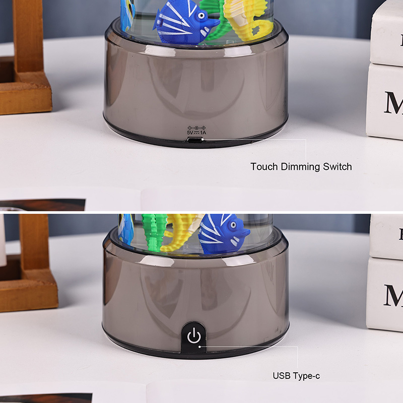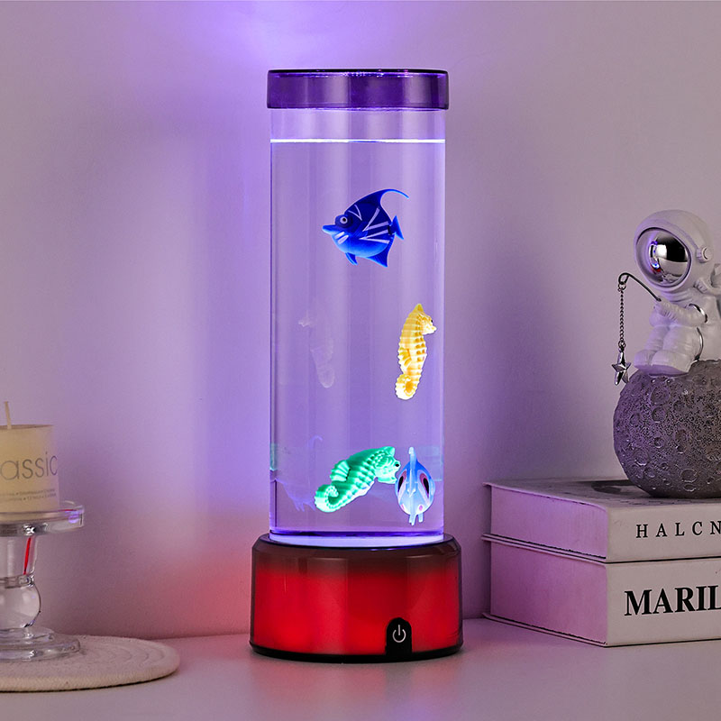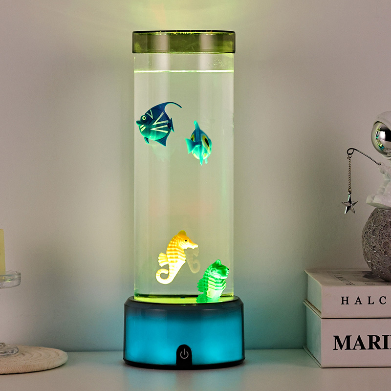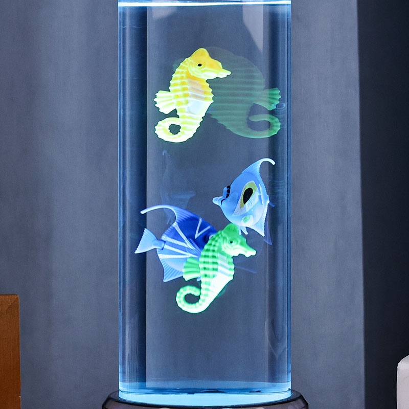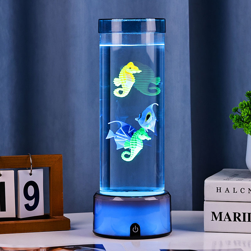 cazibədarlıq. Yüksək keyfiyyətli, davamlı plastikdən hazırlanmış bu cazibədar lampa şəffaf maye və gözəl detallı üzən balıq fiqurları ilə doldurulmuş parlaq silindrik gövdəyə malikdir, o cümlədən canlı tropik balıqlar və cazibədar dəniz atı istənilən otağa əmin-amanlıq və vizual həzz gətirən sakit, canlı okean mənzərəsi yaradır.