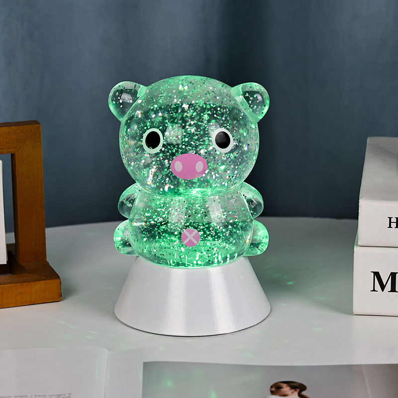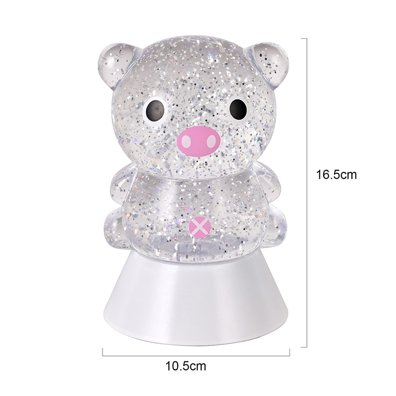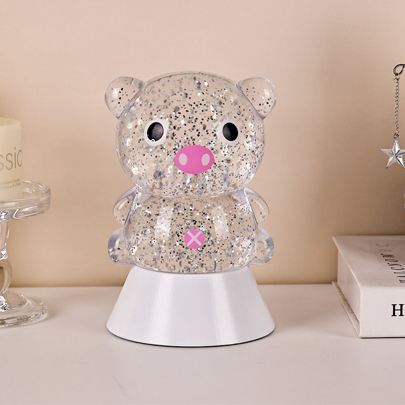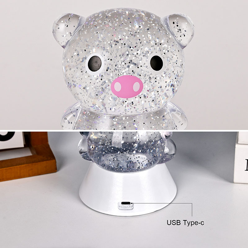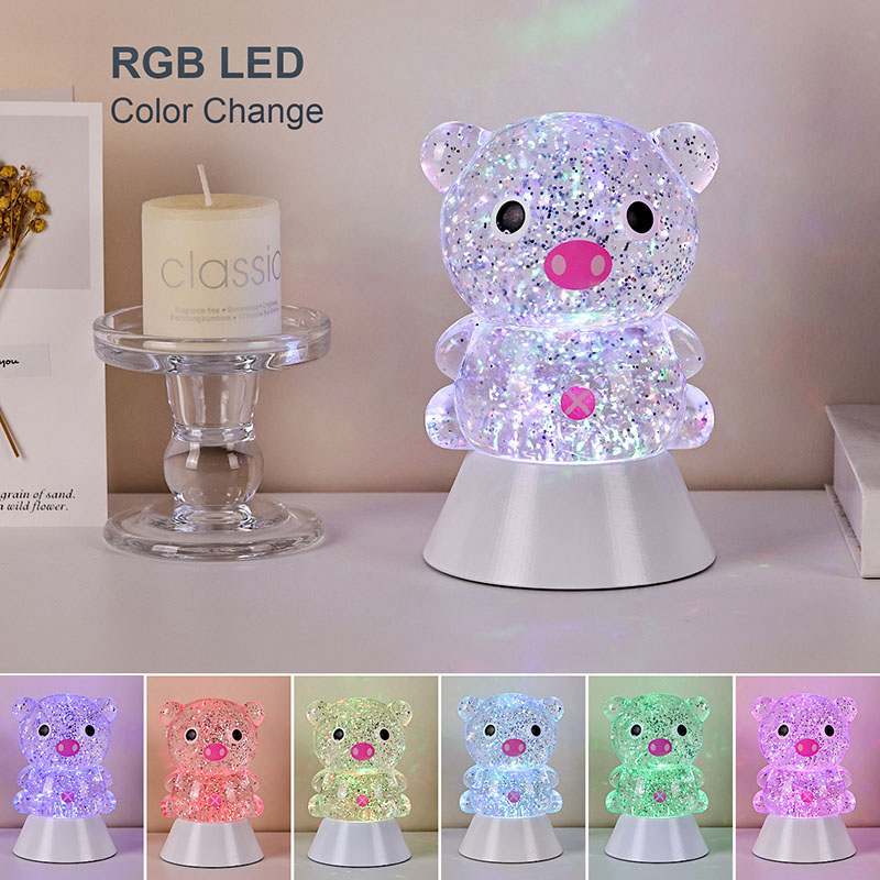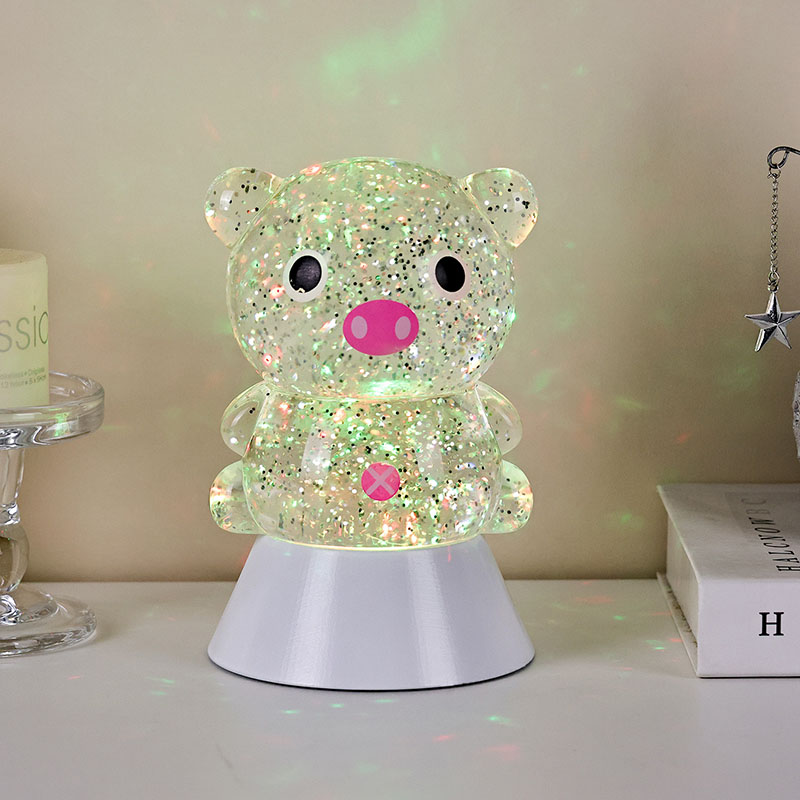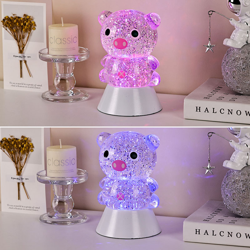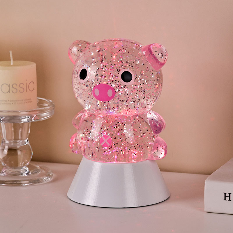 Ümumi dizaynda iri gözlərlə birləşdirilmiş yuvarlaq və dolğun konturları, çəhrayı burnu və sevimli balaca qulaqları ilə həm böyüklərin, həm də uşaqların ürəyini dərhal ələ keçirən sevimli və cazibədar donuz obrazı var. Şəffaf qatran qabığı parıldayan rəngli payetlər və xüsusi maye ilə doldurulur, işıqlar yandırıldıqda maye ilə zərif şəkildə axar və donuz bədənində axan ulduzlu çay kimi xəyalpərəst vizual effekt yaradır. Açıq rənglər avtomatik olaraq dövr edir, yumşaq çəhrayı və xəyalpərəst bənövşəyi rəngdən təzə mavi və yaşıl rəngə keçir, davamlı olaraq dinc, lakin sehrli atmosfer yaradan rənglərin göy qurşağına çevrilir, sanki nağıl dünyasını gerçəkləşdirir.