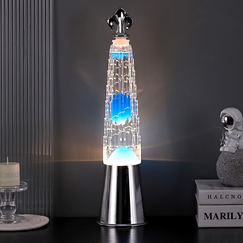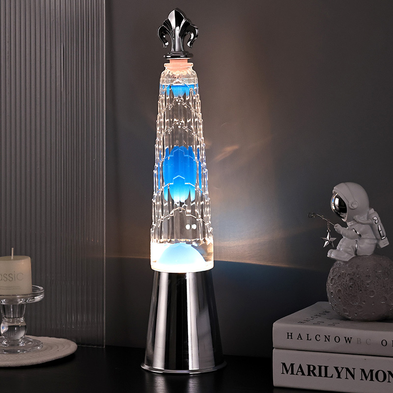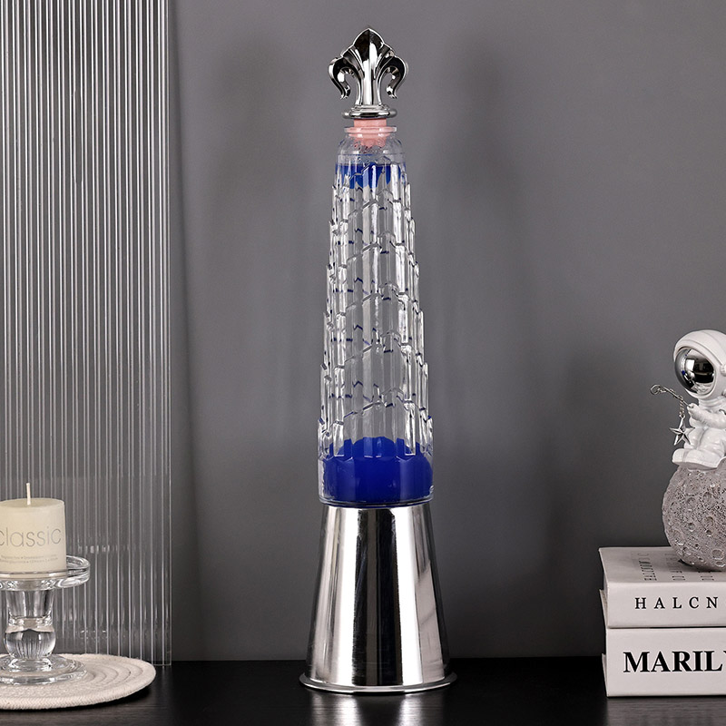 Qüllə kölgəsi lava lampası klassik qüllə formalı dizayna malikdir, yuxarıda yerləşdirilmiş incə qara metal bəzəklərlə, sadə, lakin nəcibdir. Şəffaf şüşə şüşənin içərisində mavi mum var